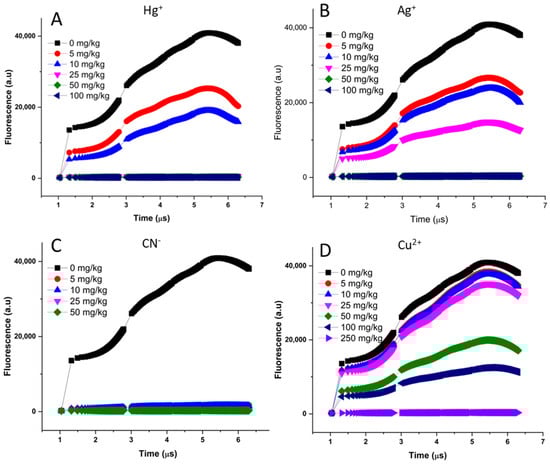 Chlorophyll a fluorescence OJIP transient curve of C. vulgaris exposed to varying concentrations of (A) mercury, (B) silver, (C) cyanide, and (D) copper over 72 h incubation period. Each step in the figure indicates the minimal fluorescence intensity when all PS II reaction centers (RC) are open (the O step), the intensity at 2 ms (the J step), the intensity at 30 ms (the I step), and the maximal intensity when all PS II RCs are closed (the P step).