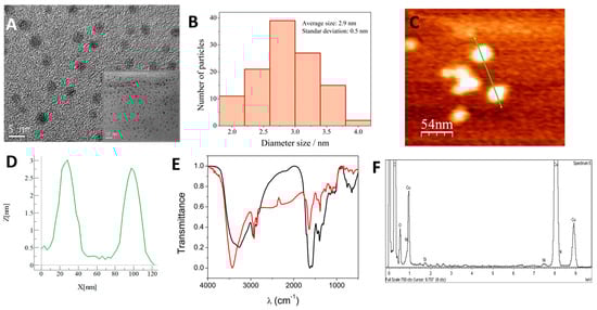 (A) TEM microscopy of the Ni-CNDs with different magnifications of 400 k and 500 k (inset). (B) Ni-CND diameter size histogram obtained from measuring 120 nanoparticles. (C) Tapping-mode AFM topographic image of Ni-CNDs and (D) topographic profile (green line) along the green line drawn at (C). (E) FTIR spectra of the CND in the absence of nickel (red line) and Ni-CNDs (black line). (F) EDX analysis of Ni-CNDs.