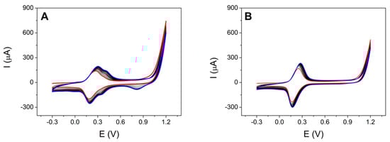 Successive CVs of the electrosynthesis of the nickel hexacyanoferrate complex applying a potential between −0.3 and 1.2 V, and 15 scans at 100 mV/s for a SPCE modified with Ni-CNDs (A) and unmodified (B) in presence of 2.0 mM K3[Fe(CN)6] 0.1 M KCl. Red CV indicates the first scan, black CVs indicate the intermediate scans, and blue CV indicates the last scan.