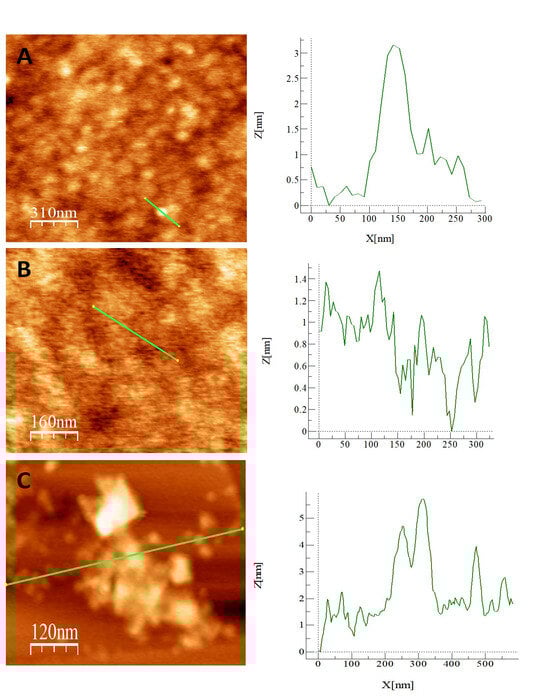 For atomic force microscopy (AFM) analysis, we employed an Olympus (Tokyo, Japan) OMCLRC800PSA cantilever (69 kHz and 71 kHz of resonance frequency) operating in air tapping mode. Screen-printed carbon electrodes have a very rough surface, so to obtain a flat carbon surface suitable for AFM, we used a flat electrode, highly ordered pyrolytic graphite (HOPG). HOPG plates (10 mm × 10 mm × 2 mm) were purchased from Goodfellow (Huntingdon, UK).
