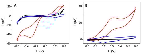 CVs obtained from an unmodified SPCE (black line) and Ni HCF-CD-modified SPCE (red line) in the presence of 1.0 mM H2O2, in 0.1 M PB at pH 7.0 at a scan rate of 10 mV/s. Ni HCF-CDs modified (blue line) in the absence of 1.0 mM H2O2. (A) Reduction potential between 0.4 and −0.6 V and (B) oxidation potential between 0.0 and 0.6 V.