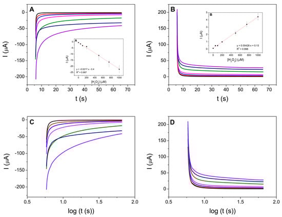 Figure 5. Chronoamperometric responses to H2O2 (A,C) reduction potential kept at −0.35 V and (B,D) oxidation potential kept at +0.30 V at SPCE/Ni-HCF-CND in 0.1 M PB, pH 7.0. H2O2 concentrations: 0 (black line), 50 μM (red line), 100 μM (blue line), 200 μM (pink line), 500 μM (green line), 750 μM (gray blue line), and 1000 μM (lilac line). Inset: calibration curve (line red) obtained for number of replicate measurements, n = 3.