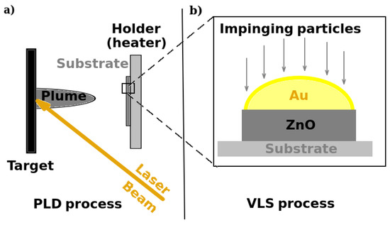 Figure 1a). Sintered ZnO powder targets were used. The third harmonic (355 nm) of an Nd:YAG pulsed laser with 400 kHz repetition rate was used to ablate the target in an atmosphere of oxygen (1 Pa). Gold was pre-deposited on the quartz substrate. The VLS growth proceeds through the nucleation of nanowires from liquid gold catalyst drops (