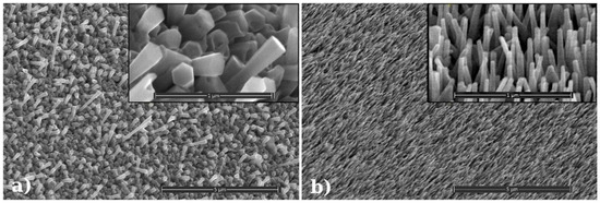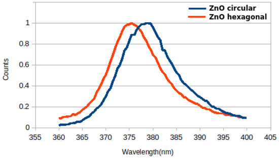 Figure 2b. As one could see, its diameter (between 30 and 60 nm, with an average of 47 nm) is about 6–7 times smaller than the hexagonal ZnO nanowire diameter (between 175 and 236 nm, with an average of 209 nm). Luminescence comparative investigations of both circular and hexagonal structures were also performed using an UV excitation source; a luminescence peak rather identical with the theoretical one (~380 nm—