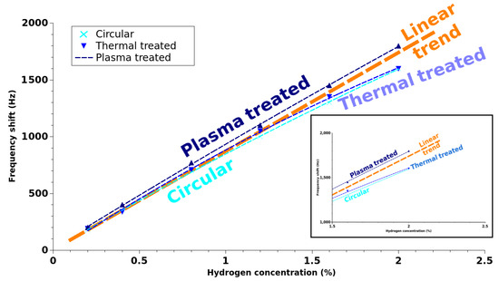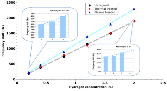 Frequency shift of the sensor with the hydrogen concentration for the three cases are presented in
