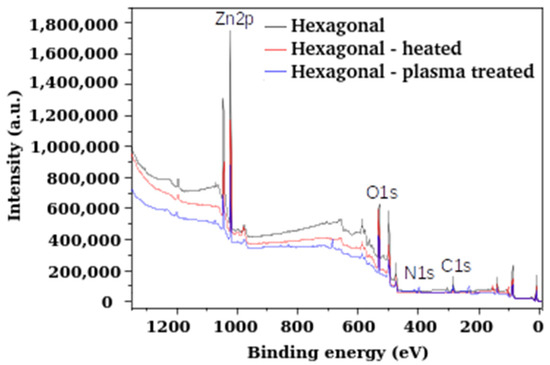 Figure 5. The peaks in the survey spectrum correspond to four chemical elements: Zn, O, N, and C. While the Zn and O are the structure elements, C corresponds to contamination from the air and plasma treatment; the presence of nitrogen only on the plasma-treated nanowires can be explained by the reaction between activated nitrogen species and the surface of the nanowires. Hydrogen plasma can activate nitrogen molecules by collisions, leading to their dissociation [