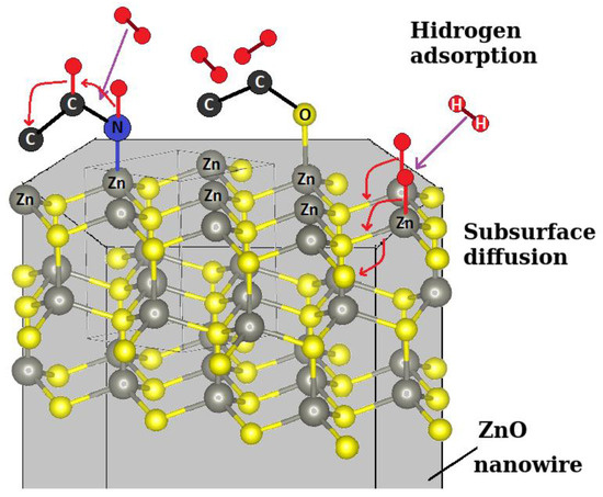 29]. The dissociated hydrogen can then migrate inside the ZnO structure through subsurface diffusion, in interstitial positions or occupying lattice vacancies [