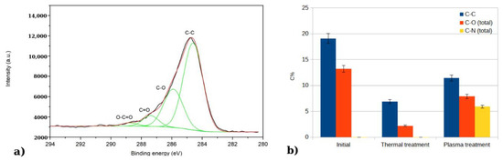 Figure 6a, the deconvolution is exemplified for the initial sample. After the thermal treatment, a decrease in carbon species is observed from the C 1s spectra, followed by an increase after the plasma treatment. In the case of the plasma-treated sample, the peaks at 286 eV and 287 eV could be attributed to both C-N and C-O bonds, as the values reported in literature for C-N bonds overlap with those for C-O bonds [