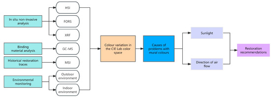 In recent years, a variety of non-destructive analysis techniques has been widely used in the international academic community. In situ non-invasive analysis offers a safer, rapid, non-destructive, and more convenient approach to analyzing various mural components. In situ non-invasive analysis can also integrate compositional, structural, and morphological information to reconstruct mural production processes and historical restoration interventions. These methods, such as multi-spectral and hyperspectral imaging (HSI), X-ray fluorescence (XRF), fibre optic reflectance spectroscopy (FORS), and portable Raman spectroscopy, are often used in combination to achieve comprehensive results [3,4,5,6,7].