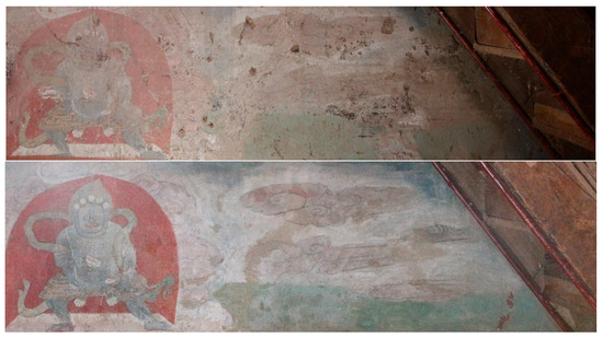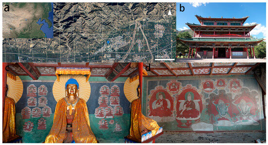 Meidai Lamasery is located in Meidaizhao Town, Tumoteyouqi (土默特右旗), Baotou City, and has been designated as China’s fourth batch of key cultural relics (Figure 2). It was the first temple established in the Mongolian region after Tibetan Buddhism was adopted. It signifies the introduction of Tibetan Buddhist art to the area. The Meidai Lamasery, known as the “ Inner Mongolia Mural Art Museum “, possesses substantial historical value for the study of Mongolian history, Buddhism, architecture, and art during the Ming Dynasty. The murals of Liuli Hall at Meidai Lamasery, created during the Ming Dynasty and painted between the 40th and 42nd years of the Wanli reign (1612–1614), are distinguished by their vibrant colours, smooth lines, and lively expressions of the Buddha statue [35]. The murals illustrate the profound teachings of Buddhism and are considered to be a showcase of the exceptional craftsmanship of the painters. These murals, primarily featuring themes of Tibetan Buddhism, distinctly depict the cultural and artistic exchanges among Mongols, Tibetans, Han Chinese, Manchus, etc. Furthermore, they reflect the Mongolian integration of Han cultural traditions and Tibetan Buddhist aesthetics, resulting in a distinctive artistic style.