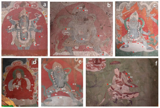 The representative areas of the murals in Liuli Hall of Meidai Lamasery were selected for sampling, which were dust accumulation areas on the left part of the south wall (Figure 3a), the right part of the south wall (Figure 3b), fading area (Figure 3c), unfaded area (Figure 3d,e), and historical restoration area (Figure 3f). The distribution of sampling points is shown in Figure 3.
