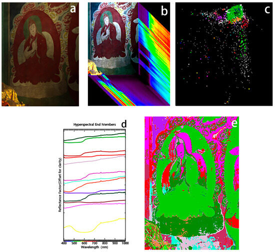 The processing workflow of hyperspectral images is as follows: Firstly, non-destructive identification of the mural pigments was carried out using HIS techniques to reveal the specific distribution and material composition of the pigments on the surface of the mural. In this section, a spectral cube of the mural’s unfaded area, the image of Master Atisha (Figure 4a) in tLiuli Hall of Meidai Lamasery, was acquired through a hyperspectral camera, producing a cube image for analysis (Figure 4b). The calibration was conducted in simultaneous mode on a standard whiteboard. Spectral image processing was performed with ENVI’s Spectral Hourglass Wizard mode. The first 30 MNF feature images were extracted from a cube of 204 bands, and pixel purity index (PPI) maps were obtained using 100,000 iterations with a threshold of 1 to find the most important pixels in the painting. Clustering was performed using the Nd-visualizer algorithm (Figure 4c) to obtain 13 endmember spectra (Figure 4d). To obtain information on the spatial distribution of the spectral endmember (Figure 4e), the spectral angular mapping (SAM) algorithm was used. Pigment composition and spatial distribution were determined by comparing the reflectance spectra of the endmember with a database of published mineral spectra and FORS data collected in situ.