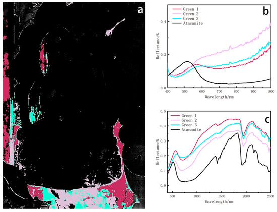 There are three endmembers in the green area, corresponding to the background region and the part of the halo of the Buddha (Figure 6a). Spectral analysis reveals that the spectra of the three clusters of green are not the same. The pink and blue-green colour area detected contamination on the mural. The three green endmembers exhibit peaks around 570 nm, and the HSI spectrum corresponds with chlorocopperite (Figure 6b) [41]. To ascertain the pigment used in this area, fibre-optic reflectance spectroscopy was conducted to analyze the material composition. Fibre-optic reflectance spectroscopy reveals that the three spectral curves exhibit an absorption band for Cu2+ and another absorption band at 2000 nm, which is consistent with the spectra of chlorocopperite (Figure 6c). Further identification based on microstructure observation and Raman spectroscopy indicates that the pigment is paratacamite, a common green pigment in ancient Chinese mural painting, as detailed in the Supplementary File.