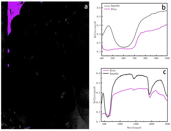 An endmember is located in the blue region, corresponding to the sky depicted in the mural (Figure 7a). A rise in reflectance at 600–700 nm aligns with the properties of blue mineral pigments. The HSI spectrum corresponds to azurite (Figure 7b), which exhibits characteristic absorption bands between 500 and 600 nm and near 1900 nm, along with distinct reflectance features between approximately 480 nm and 700–750 nm. To further determine the pigment used in this region, fibre-optic reflectance spectroscopy was conducted to analyze the composition of the substance (Figure 7c). It was found that blue pigments have absorption peaks in the visible and near-infrared region, around 500 nm and 1900 nm, which are usually associated with moisture O-H vibration or carbonate C-O vibration, corresponding to the characteristics of moisture or carbonate minerals. The absorption peaks around 500 nm and 1900 nm of the standardized PU of lithopanax are related to the hydroxyl O-H vibration and carbonate CO32− absorption characteristics. Therefore, the mineral pigment was confirmed to be azurite [42].