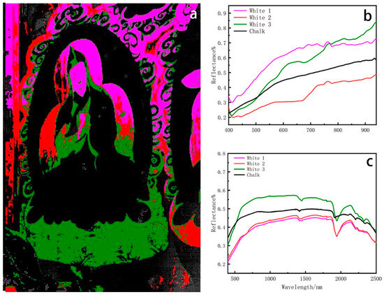 There are three endmembers in the white region, corresponding to the Buddha’s halo, the Lotus Throne, and the cloudy part (Figure 8a). Spectral analysis revealed that the spectra of the three white clusters were not similar. The pigment colouration was not uniform when observed on site and was found similar to chalk through spectral matching (Figure 8b). In order to further ascertain the pigment used in this area, optical fibre reflectance spectroscopy was conducted to analyze the material’s composition (Figure 8c). Spectral analysis revealed that the three end elements of white colour had absorption peaks at 1447 nm and 1945 nm, aligning with the fundamental spectrum of chalk [43].