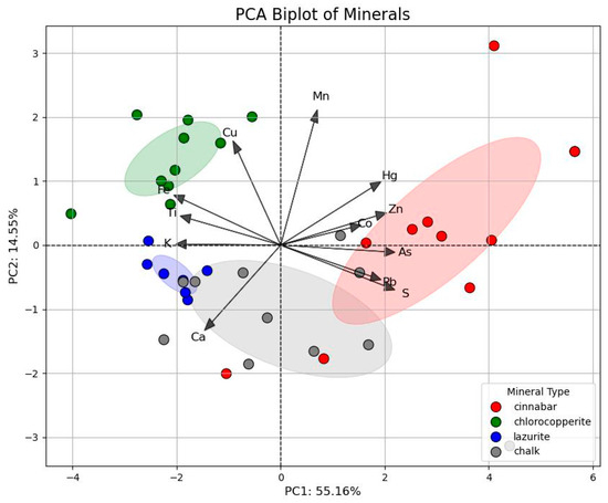 PCA analysis was performed on the concentration value data of each element obtained by XRF. Figure 9 showed that the first two principal components (PC1, PC2) accounted for 51.46% and 17.75% of the variance, respectively. The inorganic pigments are divided into four groups based on their different principal components. A large amount of Hg was detected in the red pigment test points, validating the use of cinnabar pigments, with a small amount of Pb element indicating the presence of Pb-based material in the mural paintings, maybe attributable to lead white or minium. The green pigment exhibits a significant content of Cu, and, combined with the hyperspectral analysis results, it is assumed that the green pigment is chlorocopperite. The XRF analysis of the blue pigment reveals a high intensity of Ca and Cu, suggesting the presence of calcite or azurite. The presence of Ca can be attributed to the stratigraphic structure of the mural at Meidai Lamasery, which consists of a ground layer, a white layer, and a pigment layer (see Supplementary File S4). Additionally, a notable Cu signal is detected, along with an absorption peak at 1900 nm in the FORS, which is consistent with the characteristics of azurite. Consequently, it is inferred that the colour pigment used in the mural is azurite. The mural exhibits a significant concentration of Fe, and the hyperspectral signature in the 400–600 nm range does not align with the standard spectrum of azurite. This spectral discrepancy, together with the elevated Fe signal, suggests possible interference from restoration materials, such as Prussian blue (Fe4[Fe(CN)6]3), commonly used in modern conservation. There is consistency between XRF and HSI results. The samples represented by the green and blue points are relatively clustered, indicating low variability in the chemical composition of these minerals. In contrast, the two red points significantly deviate from the other samples, particularly along the positive direction of PC1 and the negative direction of PC2. These points, located in the non-faded region, exhibit elevated concentrations of As and Hg, suggesting the use of cinnabar as the primary pigment. Although As is present at relatively high levels, no evidence of orpiment or realgar was observed in the corresponding microstructure or Raman analysis. The arsenic may originate from trace impurities in mineral cinnabar or from naturally occurring arsenic-bearing accessory minerals.