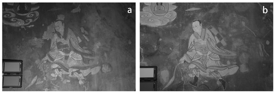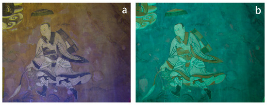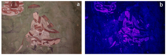 Multi-spectral imaging can obtain pigment distribution. Under visible light, the brushstrokes exhibit identical reflectance or transmittance to the surrounding substances, which cannot be distinguished by human eyes. Some painting pigments exhibit different absorption rates of infrared and ultraviolet light, creating a contrast with reflective substances when subjected to infrared and ultraviolet radiation. These characteristics enable the analysis of mural paintings’ pigments, binding materials, contour details, underlying information, repair traces, and defacement notes, etc. [50].