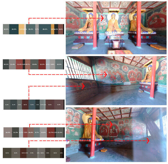 K-Means clustering was performed in RGB mode on the model exported after 3D scanning and constructed colour-scale spatial models (Figure 15). The results indicate that the colours of the south wall are predominantly blue, green, and yellow, with small amounts of black and red. The colours of the west wall are mainly green, grey, red, blue, and orange. The colours of the east wall are mainly green, grey, red, blue, and brown. The colours of the south wall are mainly green, grey, red, and blue. The colours of the overall mural are green, grey, red, and blue. The murals exhibit diminished lightness and saturation due to dust and other factors.