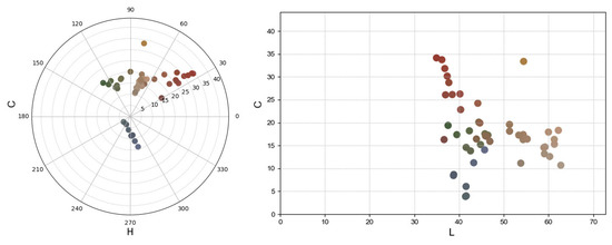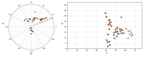 There was a conversion from the CIE Lab model to the more intuitive CIE LCh model, which was then used to construct the colour space model. The hue angles of these colours are distributed mainly between 0–60° and 240–300°, corresponding to warm reds, yellows, and cool blues, respectively. The green hues are positioned around 90–150° (Figure 16). The saturation chroma of most colours is in the low-to-medium range, indicating that the colour has experienced some degree of fading or discolouration, which is related to pigment ageing, the effects of environmental factors, or degradation of the binding material. The tendency for colour dots to cluster indicates that some of the colour may have changed due to oxidation, degradation, or surface contamination. Over time, the original vibrancy has diminished.