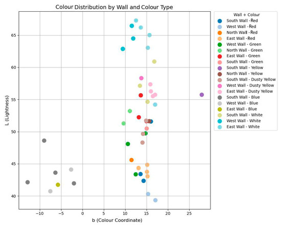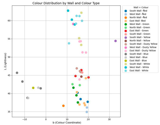 In specific areas, except for white and dusty yellow, the average L value of the south-wall mural samples is notably higher than those of the east and west walls. The b-values on the east and west walls are also higher than those on the south wall. In cinnabar-rich regions, the L values are low, likely reflecting reduced brightness due to light-induced degradation [51,52], which is consistent with the visibly darkened cinnabar observed on site. Most b-values range between 10 and 20, except for the blue regions (Figure 17).