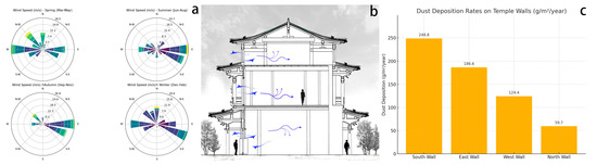Meidaizhao is located in Inner Mongolia and belongs to the temperate continental climate, which is dry throughout the year with little rain, especially in the spring when there is more sandy weather. According to the China Meteorological Data Service Center, the prevailing wind direction is usually north-west (Figure 20a). This means the following: the north wall is relatively less exposed to the wind, but the south wall is located on the windward side and is prone to becoming a sand accumulation point. When the sand and dust carried by the wind touches the south wall, it settles due to the reduced wind speed, leading to increased dust accumulation. The interior space of Liuli Hall is weakly lit, especially the south wall, which is less exposed to sunlight than the interior. Additionally, the air convection effect is weakened, and it is a low-velocity zone of air flow, leading to the easier deposition of dust. In buildings, hot air is usually discharged from high places, while the airflow in low places is relatively stagnant. The south-wall mural is in a lower position with insufficient thermal pressure effect, the air flow is low, and dust is more likely to accumulate (Figure 20b). Regarding indoor dust accumulation, we collected particulate data from Liuli Hall between 12 May 2024, and 12 May 2025. The measured deposition rates ranged from 59.70 to 248.76 g/m2, with the highest accumulation observed on the south and east walls. These results indicate significant indoor particulate pollution contributing to the colour change in the murals, and data collection is still ongoing (Figure 20c).