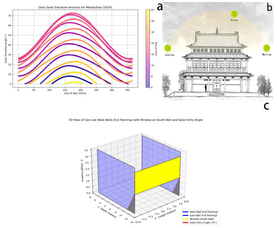 (a) Daily solar elevation analysis for Meidaizhao (2024). (b) Daily sunlight exposure diagram of Liuli Hall. (c) A 3D view of east and west walls with window on south wall and solar entry angle.