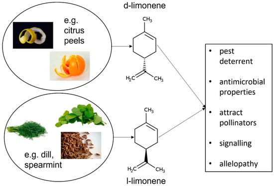 Erasto and Viljoen have described in a review several important roles of limonene in plants. The compound constitutes a defence mechanism for pest deterrent, where the strong citrus scent of limonene acts as a repellent to many herbivorous insects and pests, reducing the likelihood of plant damage. Moreover, limonene has antimicrobial properties that can help protect plants from various pathogens, including fungi and bacteria. Another evolutionary purpose of limonene is the attraction of pollinators. The aroma of limonene can attract pollinators such as bees and other insects, aiding in the plant’s reproduction for facilitating pollination. Additionally, some plants release limonene into the surrounding soil, which can inhibit the growth of competing plants. This phenomenon, known as allelopathy, helps the limonene-producing plant reduce competition for resources such as nutrients, water, and light (Figure 1) [].
