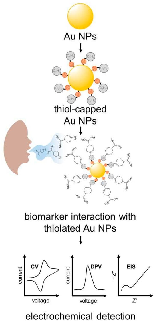 - Nazir, N.U.; Abbas, S.R.; Nasir, H.; Hussain, I. Electrochemical Sensing of Limonene Using Thiol Capped Gold Nanoparticles and Its Detection in the Real Breath Sample of a Cirrhotic Patient. J. Electroanal. Chem. 2022, 905, 115977. [Google Scholar] [CrossRef]