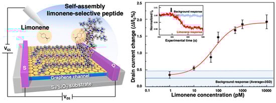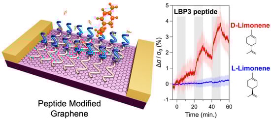 - Rungreungthanapol, T.; Homma, C.; Akagi, K.I.; Tanaka, M.; Kikuchi, J.; Tomizawa, H.; Sugizaki, Y.; Isobayashi, A.; Hayamizu, Y.; Okochi, M. Volatile Organic Compound Detection by Graphene Field-Effect Transistors Functionalized with Fly Olfactory Receptor Mimetic Peptides. Anal. Chem. 2023, 95, 4556–4563. [Google Scholar] [CrossRef]