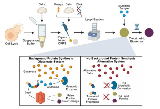 In this work, we engineered a novel cell-free protein synthesis (CFPS) system that utilized alternative salts to produce a paper-based, colorimetric glutamine biosensor that overcomes prior background limitations while maintaining a sufficient yield for the sensor to function (Figure 1). It was hypothesized that metabolic enzymes such as glutaminases converted the high concentrations of glutamate into glutamine, resulting in the significant unwanted protein synthesis of our previous sensor [,]. Here, we quantitatively examine three alternative cell extract compositions and four alternative PANOxSP compositions to determine an optimal composition for glutamine sensing.