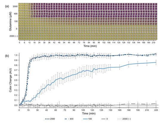 The paper-based, lyophilized sensor format was prepared according to previously reported protocols [,]. First, 12 μL liquid solutions containing all cell-free reagents besides glutamine were pipetted onto chromatography paper (Thick Chromatography Paper Grade 238, VWR 28342-036, VWR International, Radnor, PA, USA) and then lyophilized for 24 h. Chromatography paper was chosen as the paper substrate based on favorable results from prior work comparing the compatibility of cellulose, nylon, chromatography paper, and other paper substrates with cell-free protein synthesis biosensors []. DNA encoding for β-galactosidase and its substrate CRPG were used for this sensor format. The assay was performed by rehydrating the papers with 12 μL aqueous solutions containing glutamine at the indicated concentrations. The papers were then covered with clear tape to prevent dehydration before being placed in an incubator at 37 °C. The assay was photographed using an iPhone XR smartphone every 3 min for 150 min followed by every 15 min until t = 225 min. Each condition was run in triplicate.