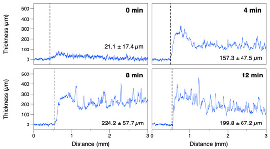 Thickness profile of PEDOT: PSS coatings obtained after 0 min, 4 min, 8 min, and 12 min of electrodeposition at 100 µA. The initial (0 min) plot corresponds to the thickness profile of the screen-printed substrate. Measurements were carried out using a KLA Tencor P-15 Profilometer with a horizontal resolution of 200 nm. Data represent the average of two electrodes (Values shown at the bottom right of each graph indicate the average thickness of the coating (±standard deviation)).