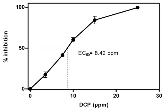 The biosensor response was quantified as a percentage of inhibition (I%) relative to untreated controls. As shown in Figure 6, microbial inhibition increased with DCP concentration. No inhibition was detected at low concentrations, while measurable effects appeared at ≥2.5 ppm, reaching complete inhibition at 25 ppm. The EC50 was 8.42 ppm, in agreement with previously reported values [5,13,27,28,29,30].