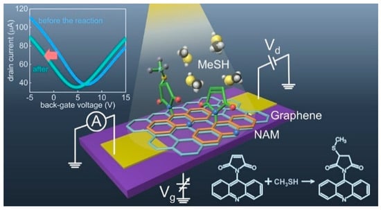 BG-FET chemical sensors operate by recording changes in the electrical properties of the channel upon interaction with the target analytes [10,43,46]. The sensing mechanism can be explained as follows. BG-FET chemical sensors utilize a channel material, such as graphene or a 2D layered material, whose electrical conductivity is modulated by both the adsorbed analytes and the applied back-gate voltage. The analyte adsorption induces charge transfer or electrostatic gating, altering the carrier density and/or mobility in the channel. This, in turn, modulates the channel’s current or conductance, which serves as the sensing signal. The back-gate bias influences the channel’s baseline carrier concentration, which can significantly amplify the sensor’s sensitivity and response to the target analyte. Changes in parameters such as the Dirac point or threshold voltage are monitored. Figure 2 schematically represents the sensing process in a BG-FET chemical sensor for methanethiol (MeSH) detection. The key aspects of BG-FET sensing mechanisms are as follows.