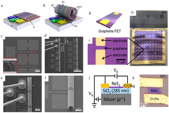 Schematic of the Ag NP/rGO BG-FET NO2 sensor in (a) 2D planar structure and (b) 3D rolled-up structure. (c) SEM micrograph of 2D planar BG-FET rGO structure with Ag NP decoration. (d) SEM micrograph of 3D microtubular Ag NP/rGO BG-FET NO2 sensor array, with one of the sensors through Au wires bonded to PCB. (e) Zoomed-in view of the bonded 3D Ag NP/rGO BG-FET NO2 sensor. (f) Zoomed-in side view of the microtubular structure. Reproduced with permission from Ref. [38]. Copyright 2025, IOP Publishing Ltd. (g) Schematic of the graphene BG-FETs. (h) Optical image of the device. (i) Enlarged optical image of the graphene channel. Reproduced with permission from Ref. [4] Copyright 2025, American Chemical Society. (j) Schematic and (k) optical image of the ReS2 BG-FET. Reproduced with permission from Ref. [17]. Copyright 2025, American Chemical Society.