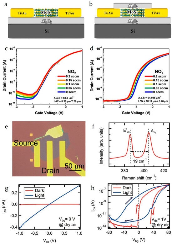 - Im, H.; AlMutairi, A.; Kim, S.; Sritharan, M.; Kim, S.; Yoon, Y. On MoS2 Thin-Film Transistor Design Consideration for a NO2 Gas Sensor. ACS Sens. 2019, 4, 2930–2936. [Google Scholar] [CrossRef]