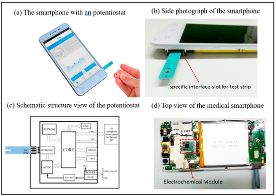(a) Photograph of the proposed medical smartphone in which an electrometer has been preburied. (b) Side photograph of the proposed medical smartphone: slot is the interface for insertion of UA test strip. (c) Schematic structure view of the electrometer; a micro controller for resolving the electrochemical current formed in the test strip. (d) Top view of the layout of the medical smartphone: the electrochemical module is integrated with the main print circuit board of the smartphone [43]. Copyright 2016, American Chemical Society.