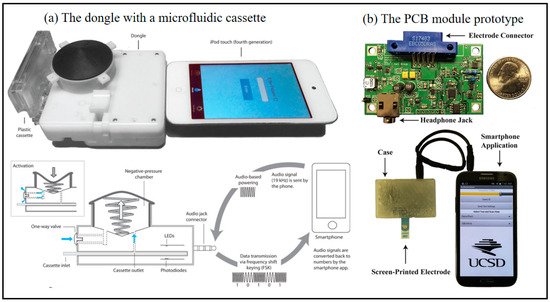 Smartphone-based immune biosensor at POC. (a) Images of the dongle with a microfluidic cassette connected to an iPod touch and schematic diagram of dongle highlighting a power-free vacuum generator using the audio jack connector for audio based powering and frequency shift keying (FSK) data transmission to a smart-enabled device [54]. Copyright 2015, The American Association for the Advancement of Science. (b) Photograph of the PCB module prototype and the module being powered by and communicating with a Samsung Note 2 (Seoul, South Korea, Samsung Electronics), including electrode connector with headphone Jack (Independently developed by the team), smartphone application, Screen-printed electrode [55]. Copyright 2016, Elsevier.
