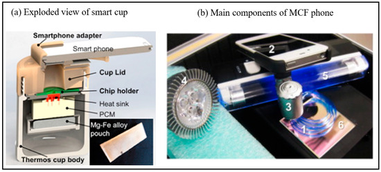 (a) Exploded view of the chemically heated cup. The cup consists of a thermos cup body, a 3D-printed cup lid, a chip holder, PCM material, heat sink and single-use Mg–Fe alloy pack heat source [59]. Copyright 2016, American Chemical Society. (b) Main components of MCF phone (1) Microcapillary Film (MCF) (2) Smartphone (3) Magnifying lens (4) Blue LED (5) UV black light for fluorescence detection, light source for chromogenic detection (6) dichroic filter [61]. Copyright 2015, Elsevier.