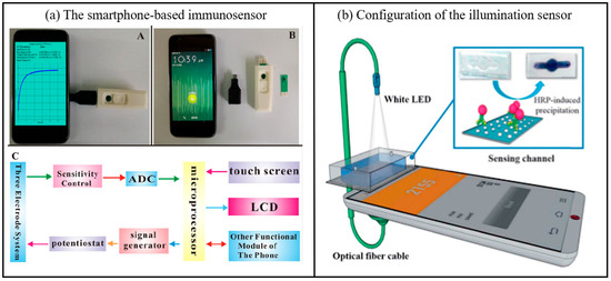 (a) A photograph of the smartphone-based immunosensor, a picture of the smartphone, USB port, chip box and screen-printed carbon electrode, An electrical circuit frame diagram of the mobile electrochemical device (ADC: analog to-digital converter. LCD: liquid crystal display.) [62]. Copyright 2016, Elsevier. (b) Configuration of the illumination sensor, including white LED, sensing channel, optical fiber cable [48]. Copyright 2018, Elsevier.