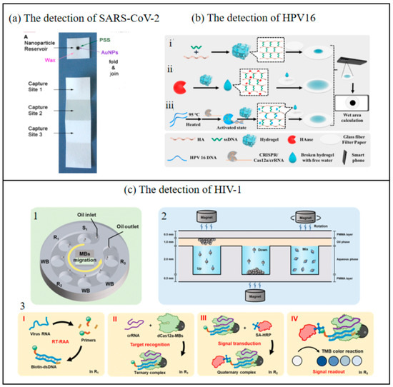 (a) The chip of SARS-CoV-2 detection [84]. Copyright 2021, Elsevier. (b) Working principle of the up and down chip for HIV-1 detection. i—Preparation of hydrogel; ii—HAase detection process; iii—HPV 16 DNA detection process. (HA-Hyaluronic Acid, HAase- Hyaluronidase) [37]. Copyright 2025, Elsevier. (c) Paper-based biosensor for the points of care testing HAase and HPV 16 DNA using wet area as readout. 1—Schematic diagram of the chip structure. 2—MB migration and mixing mode. 3—Principle of nucleic acid detection based on dCas12a in the up and down chip. I—Reverse transcription and exponential amplification of target RNA through RT-RAA reaction. II—Target recognition by dCas12a-modified beads. III—Signal transduction through the capture of HRP-SA. IV—Signal readout based on the color change reaction. (SA-HRP—Streptavidin Conjugated with Horseradish Peroxidase) [85]. Copyright 2023, Royal Society of Chemistry.