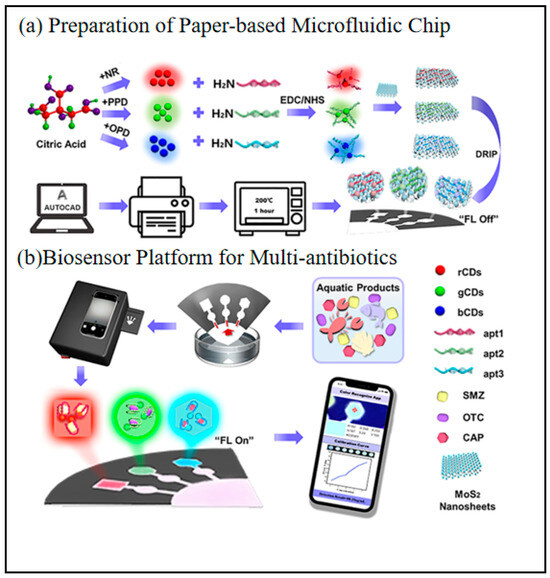 Antibiotics are commonly used in aquaculture to control various bacterial diseases, improve feed utilization and reduce the need for certain nutrients [133,134]. At the same time, there are increasing concerns about the safety of aquaculture products, especially after the widespread rejection of aquaculture products in importing countries due to the presence of banned antibiotic residues. Tong et al. designed a laser-printed paper-based microfluidic chip based on a multicolor fluorescent CD aptasensor (mCD-μPAD aptasensor) for the simultaneous in situ [41]. In addition, a 3D-printed portable test kit was designed to visually analyze sulfadimethoxine (SMZ), OTC, and CAP via a smartphone, and a third-party smartphone color-recognition application recognizes the RGB value of the fluorescent paper image in the presence of the target, enabling simultaneous and visual detection of antibiotics in aquatic products (Figure 12). Under optimal conditions, the limits of detection (LOD) of this sensor for sulfamethazine (SMZ), oxytetracycline (OTC), and chloramphenicol (CAP) are 0.47, 0.48, and 0.34 ng/mL, respectively. In the detection of actual shrimp samples, the recoveries of the three antibiotics are 95.2–101.2%, 96.4–105%, and 96.7–106.1%, with relative standard deviations (RSD) all below 6%. Under optimal conditions, this μPAD allows for a fast response of 15 min for SMZ, OTC, and CAP, and this paper-based sensor opens up avenues for in situ, high-throughput, and rapid detection methods that can be widely used for POCT in food safety.