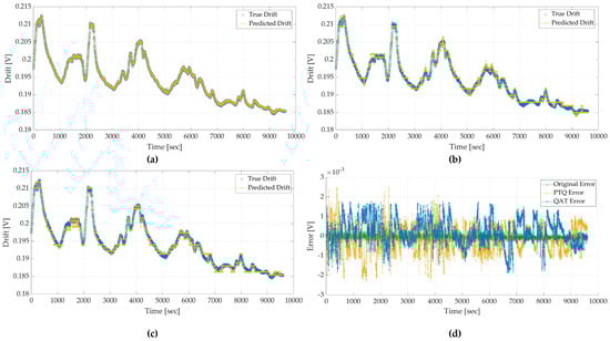 Figure 8b,c show the results for the quantized models (PTQ and QAT, respectively). The quantized models also capture the overall drift trend accurately, with only minor amplitude deviations. The fact that the orange and blue curves remain nearly overlapped in panels (b) and (c) demonstrates that quantization has not introduced any appreciable bias or lag in the drift prediction. In practical terms, all three models successfully reconstruct the slow baseline shifts over time, effectively removing drift to reveal a stable baseline. Panel 8(d) shows the instantaneous prediction error (in millivolts) across all three models. Overall, all three models effectively reconstruct the slow drift dynamics over time, validating that on-device inference, using only 8-bit arithmetic, achieves the same level of drift compensation as the original full-precision model.