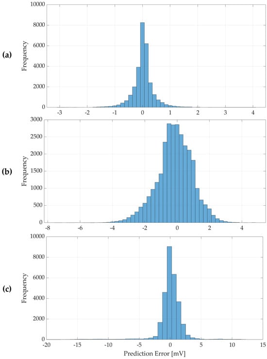 Figure 9a (float32), the residuals cluster narrowly around 0, with a roughly Gaussian shape. The vast majority of errors are within ~0.25 mV, and the peak of the histogram is at 0 with a high frequency—indicating most predictions are nearly exact. For the PTQ model (