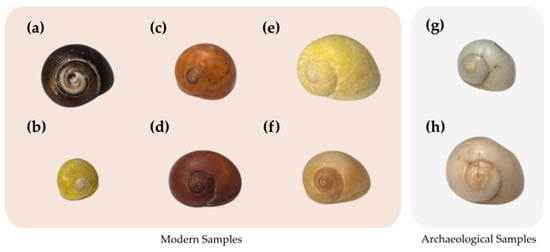The second set, which forms the core of this study for non-destructive color prediction, incorporates a collection of modern and archaeological L. obtusata/fabalis shells, which exhibit varied color tones. Among these are two Mesolithic shells (labeled LIT235.3 and LIT885.1) which are associated with a human occupation in La Chora cave (Voto, Cantabria, northern Spain) and dating between 8170 and 7800 cal BP [27]. The two archaeological samples lack the distinct coloration observed in the modern ones, presenting a whitish and dull appearance. The second collection is shown in Figure 1.