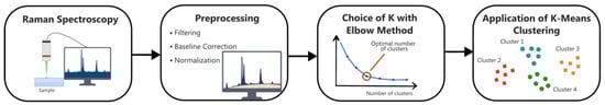Raman data analysis workflow using k-means clustering, including data acquisition, preprocessing, optimal cluster number determination (K), and clustering application for spectral grouping.