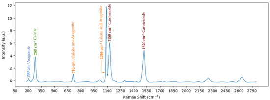 Initial analysis of the acquired Raman spectra focused on identifying the principal chemical components of the L. obtusata/fabalis shells. The dominant spectral features consistently matched those of aragonite, CaCO3, which constitutes the primary mineral phase of these shells. The most intense characteristic Raman band observed was the symmetric stretching vibration (ν1) of the carbonate group, appearing around 1085 cm−1; this peak is common to all major CaCO3 phases, including aragonite and calcite [8,30]. Other characteristic peaks of the aragonite lattice structure (around 150 cm−1, 208 cm−1, and 710 cm−1) further confirmed its identity. Polyenes, specifically carotenoids, are the primary pigments responsible for coloration in these shells. Correspondingly, the spectra frequently exhibited Raman bands of carotenoids. The most significant of these were the strong peaks associated with C-C single-bond stretching (ν2) around 1150 cm−1 and C=C double-bond stretching (ν1) around 1520 cm−1 [8,9,13,14]. The signals above 2000 cm−1 represent overtone and combination bands (mainly of the intense ν1 and ν2 bands) [12]. Figure 5 shows a representative Raman spectrum obtained from a shell sample, clearly highlighting these principal vibrational bands attributed to both the aragonite matrix and the embedded carotenoid.