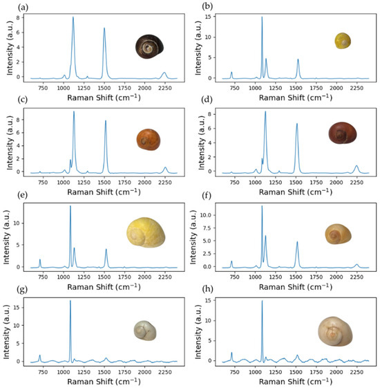 For this study, Raman spectra acquisition was performed using two distinct instrumental setups, each used for a specific analytical objective. The first method focused on the detailed analysis of pigment distribution in cross-sections of the shells, while the second was used for mapping the surface of the shells from the collection shown in Figure 1 in order to obtain spectra for clustering analysis and color prediction. Regarding the first method, for analyzing pigment distribution in cross-sections, Raman measurements were performed using a confocal RS microscope (XperRAM C-Series, NANOBASE, Seoul, South Korea), equipped with a 532 nm laser and a 20× objective lens (MPlanFL, Olympus, Tokyo, Japan, NA 0.75), allowing for high-resolution spectral acquisition. Spatial Raman mapping was conducted to analyze pigment distribution across the shell section. The mapping was performed with a step size of 5 μm in both the X and Y axes. This high-resolution approach resulted in the acquisition of approximately 3200–3400 spectra per cross-section. At each point, spectra were averaged from two individual measurements, with each measurement lasting 1.5 s and using a laser power of 2 mW.