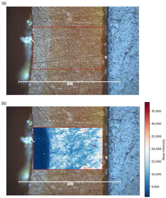 Pigment distribution analysis on the polished cross-section of an L. obtusata/fabalis shell (sample “Alive 5”). (a) Optical image of the shell’s cross-section, showing the rectangular area selected for Raman mapping; (b) Raman spectral intensity map corresponding to the carotenoid peaks (1150 cm−1 and 1520 cm−1) across the mapped area, where the color bar indicates the mean intensity of these peaks.