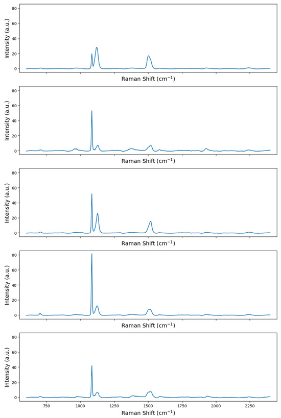 One specific algorithm employed for this purpose was k-means, an iterative partitioning method well-suited for identifying distinct groupings by minimizing the Euclidean distance between spectra and their assigned cluster centroid. A key requirement of the k-means algorithm, however, is that the number of clusters (K) must be specified beforehand. Determining the optimal number of clusters is therefore needed. Techniques like the elbow method are often evaluated to guide this selection by analyzing clustering performance metrics across different K values. This approach provides a visual way to evaluate the optimal number of clusters by examining the differences in the sum of squared errors (SSE) for each cluster. The point where the decrease in SSE is most pronounced, the “elbow”, indicates the best K values [29]. In this study, the elbow method was evaluated by testing K values in a range from 1 to 15, and K = 5 was selected based on identifying the point of inflection. The plot corresponding to this analysis is provided in the Supplementary Materials (Figure S1).